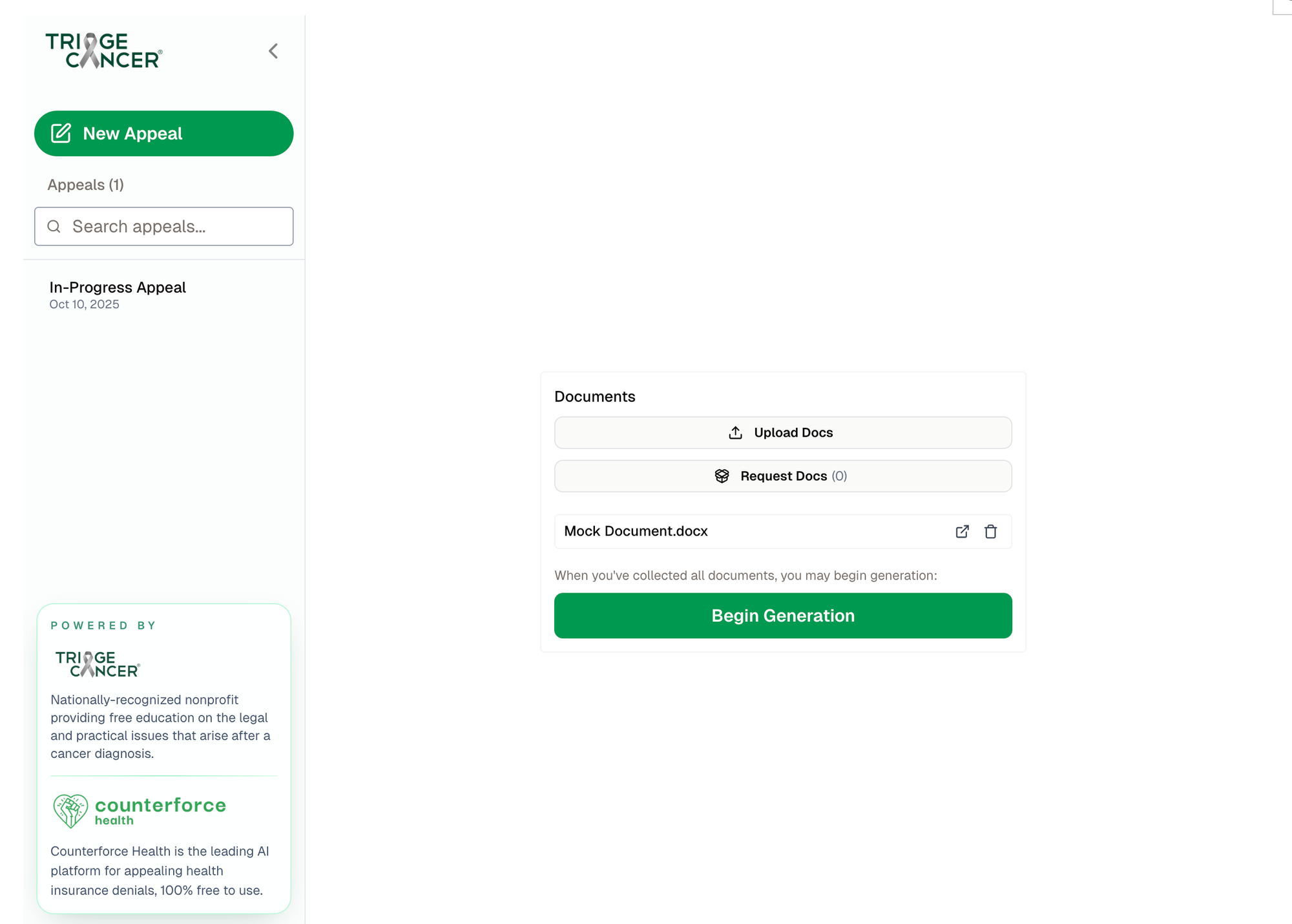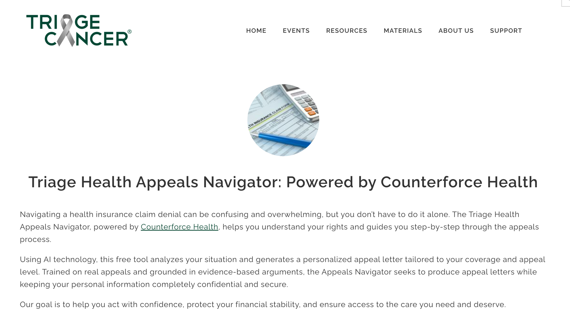 Receiving a cancer diagnosis is a battle in itself. Being hit with a health insurance denial for the critical treatment you need feels like an unfair punch when you’re already down. But here’s the crucial truth: a denial is not the final answer. At Counterforce Health, we are dedicated to flipping the script on insurance denials. That's why we are proud to power the invaluable Triage Cancer Appeals Navigator, an essential, free tool created by our partners at Triage Cancer.